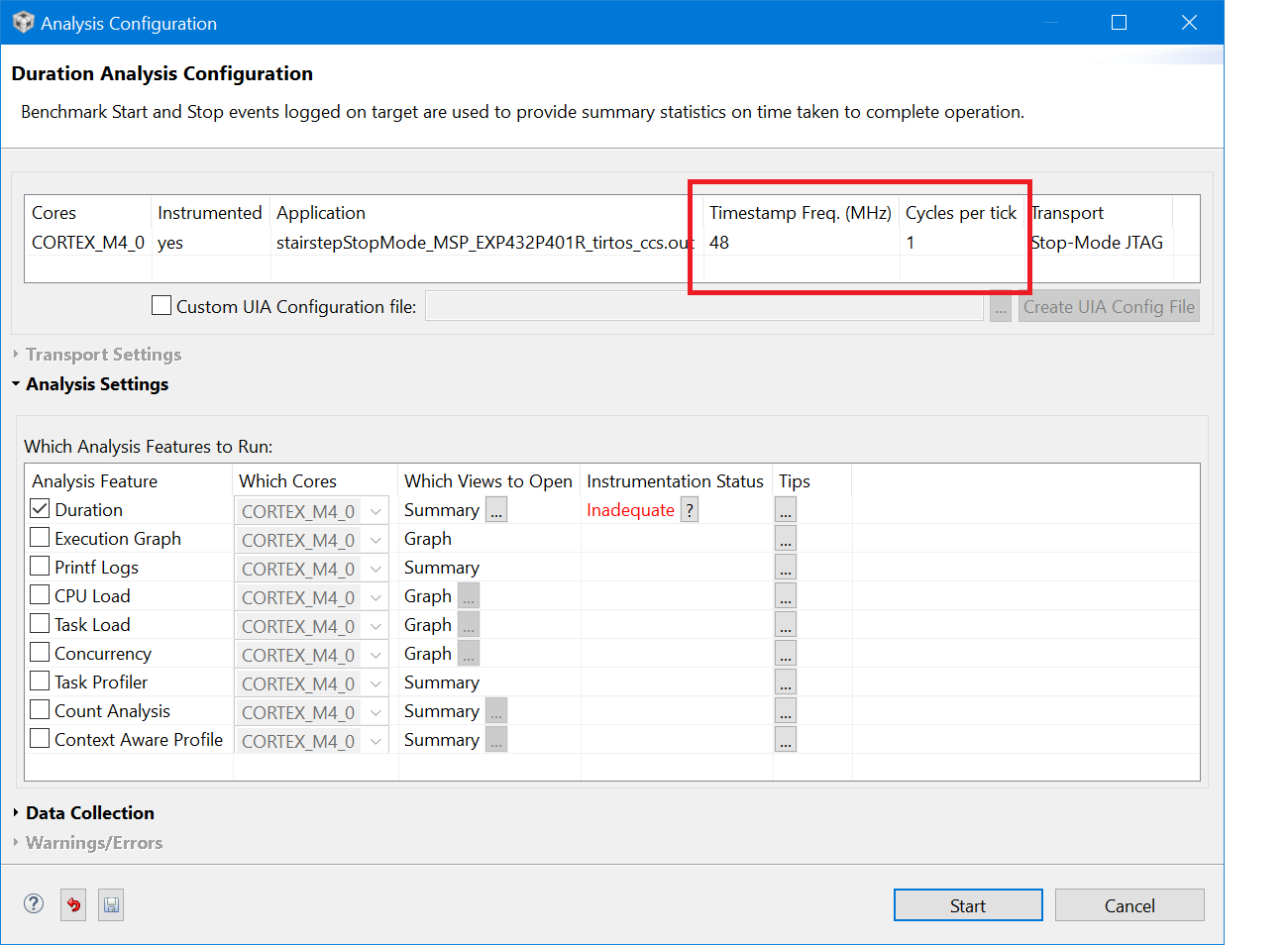 "本地时间"是在目标上生成的时间。 单位取决于器件。 "时间"列是纳秒。 请注意、在启动系统分析器时会显示转换因子。 例如、在 MSP432上、本地时间以 CPU 周期为单位、处理器速度为48MHz。