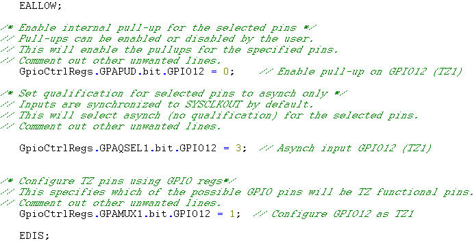 GpioCtrlRegs.GPAPUD.bit.GPIO12 = 0; //启用 GPIO12上的上拉电阻(TZ1)