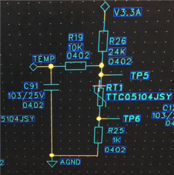 根据原理图、温度电路源信号通过由 C91和 R19+R24+RT1+R25等效 R 组成的有效低通 RC 滤波器连接到 ADCIN。 我假设这个低通滤波器正在降低 ADC 采样期间和之后源信号的恢复时间、这样、当 ADC 采样率为40kHz 时、TEMP 不能稳定在其稳定状态电压。 我怀疑可以使用 ADC 引脚上的示波器测量电压纹波。