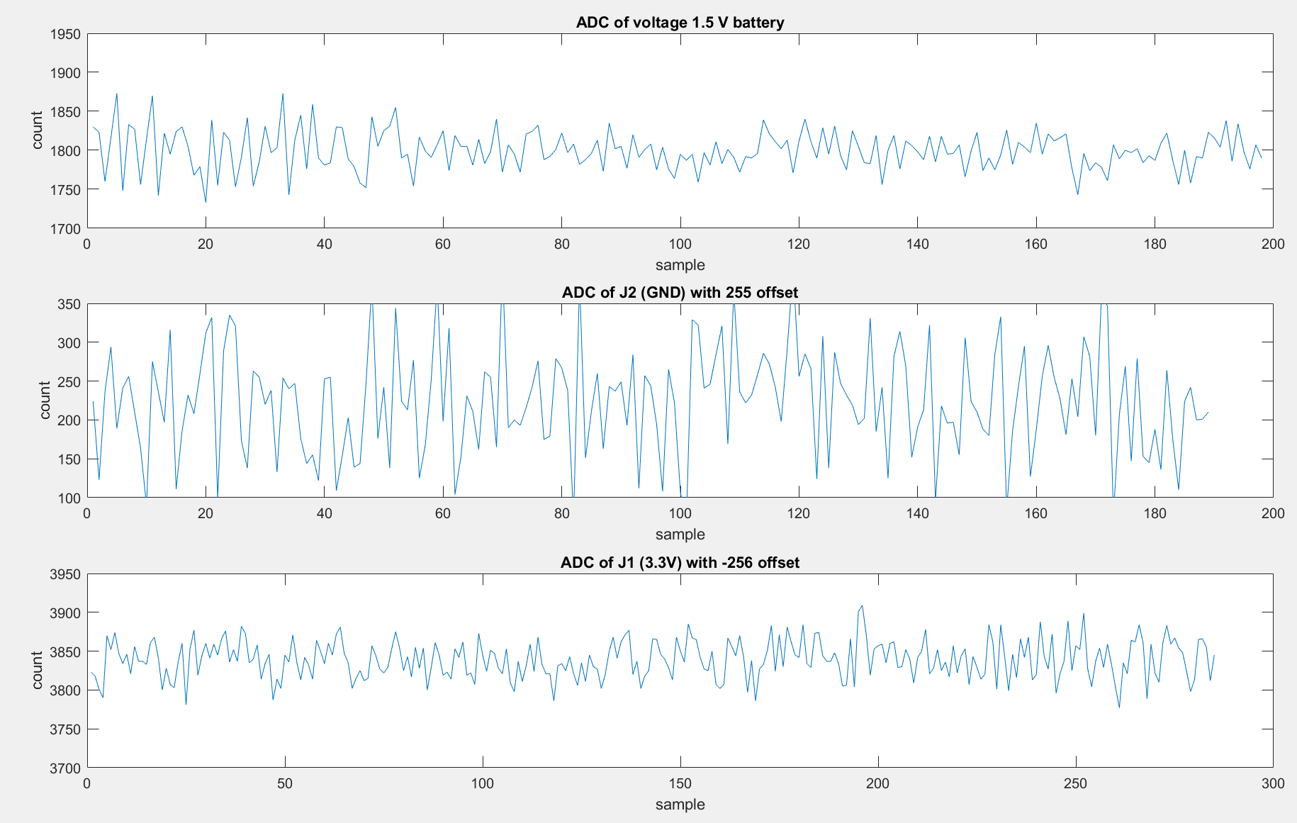 一旦证明这是有效的、尝试使用 A7对 J1-1上的3.3V 电源进行采样。 您应该会看到接近4095的稳定转换。 同样、如果读数停留在4095、则可以从 ADCOFFTRIM 中减去。