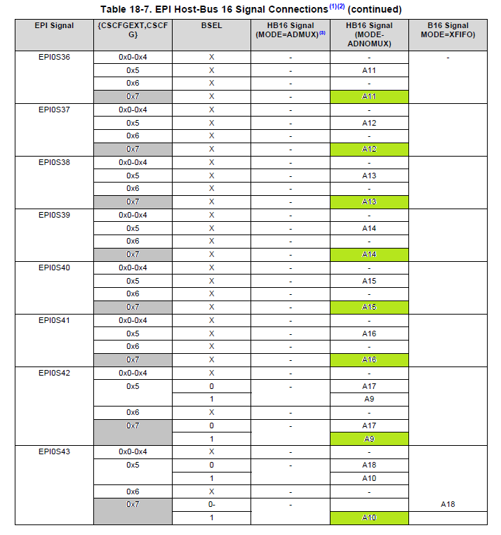 EPI0 在模式0x7 (三 CS 配置)中配置为{CSCFGEXT + CSCFG}。  您能告诉我 哪种模式 {CSCFGEXT + CSCFG}最适合此配置的 SRAM 存储器(SRAM 配置:16位数据线路和18个地址线路、具有额外的访问8/16位模式、不具有多路复用模式)。