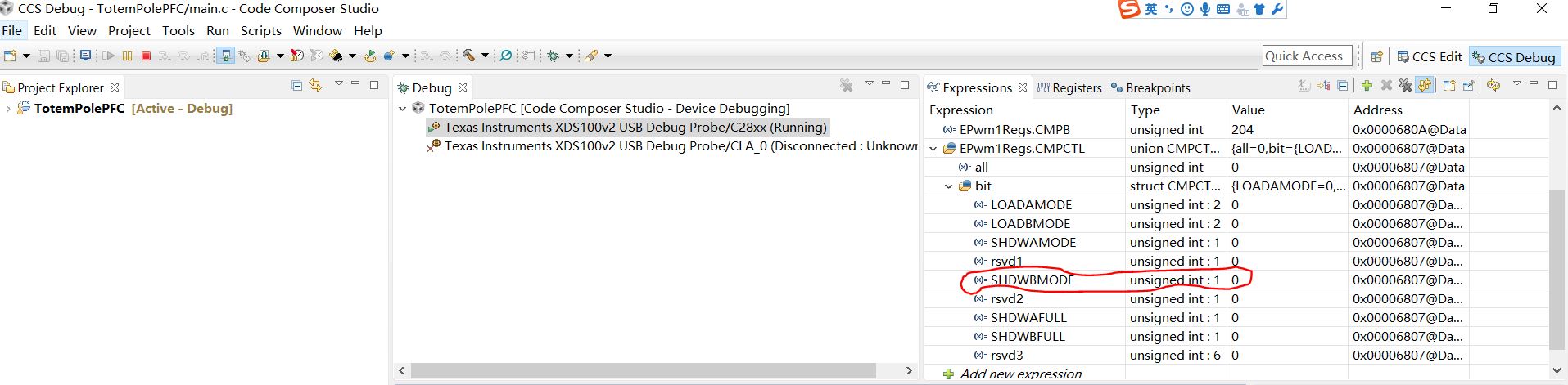 但是,结果是意料之外的。 EPwm1Regs.CMPCTL.bit.SHDWBMODE 不是"1"。 这种现象的原因是什么?