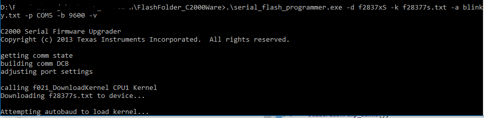 serial_flash_programr.exe -d f2837xS -k f28377s.txt -a blinky.txt -p COM5