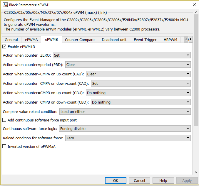 本用户手册 http://www.ti.com/lit/ug/spruh18g/spruh18g.pdf 的第255页 帮助我计算计数器比较寄存器值(4501)、第288页帮助我计算死区时间配置。 我还为 ePWM 块连接了 Simulink 模型。 在馈送信号之前、我将确保信号按比例增大到计数器比较寄存器的值。