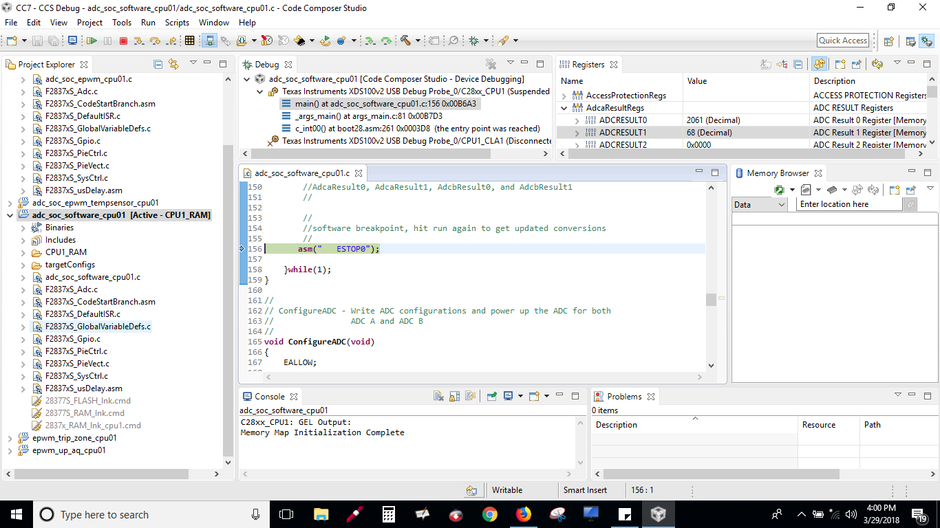 我已经使用了 V200的 ADC_SoC_epwm01或 ADC_SoC_software01中为 CCv7.0中的 TMS320F28377S 提供的参考代码。 我将在结果寄存器中获取 ADC_Values。 但是、如果我使用连续刷新运行代码、它会在 asm ("  ESTOP0")挂起。 因此、它不会注意到 ADC 引脚 AO 上的电压发生任何变化。 请帮助我解决此问题、即 ADC 值的更新。