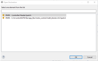 但是、我们的项目仍会以某种方式检测旧的 controlSUITE 文件。 例如、我单击结构上的 F3以查看声明。 当我单击 IPark 结构上的 F3时、它会打开此窗口、询问我们要查看哪个元素。 我只希望工程在"Header"文件夹中看到 ipark.h、而不希望看到 controlSUITE 库中的文件。 如何删除此项? 我在项目设置中进行了全面搜索、但未找到任何引用此不需要的文件路径的位置。 如果有任何帮助,将不胜感激。
