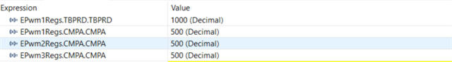 如果我尝试将 TBPRD 设置为2500、将 CMPA 设置为1250 (除以1.6)、则我的 输出 PWM 为20kHz、而目标 PWM 为50kHz。