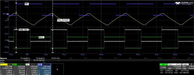void HAL_setupPWMs(HAL_MTR_Handle handle) { HAL_MTR_Obj *obj = (HAL_MTR_Obj *)handle; uint16_t cnt; uint16_t pwmPeriodCycles = (uint16_t)(USER_M1_PWM_TBPRD_NUM); uint16_t numPWMTicksPerISRTick = USER_M1_NUM_PWM_TICKS_PER_ISR_TICK; // disable the ePWM module time base clock sync signal // to synchronize all of the PWMs SysCtl_disablePeripheral(SYSCTL_PERIPH_CLK_TBCLKSYNC); // turns off the outputs of the EPWM peripherals which will put the power // switches into a high impedance state. EPWM_forceTripZoneEvent(obj->pwmHandle[0], EPWM_TZ_FORCE_EVENT_OST); EPWM_forceTripZoneEvent(obj->pwmHandle[1], EPWM_TZ_FORCE_EVENT_OST); EPWM_forceTripZoneEvent(obj->pwmHandle[2], EPWM_TZ_FORCE_EVENT_OST); #if defined(BSXL8323RS_REVA) || defined(BSXL8323RH_REVB) || \ defined(BSXL8353RS_REVA) || defined(BSXL8316RT_REVA) || \ defined(BSXL3PHGAN_REVA) || defined(HVMTRPFC_REV1P1) || \ defined(DRV8329AEVM_REVA) for(cnt=0; cnt<3; cnt++) { // setup the Time-Base Control Register (TBCTL) EPWM_setTimeBaseCounterMode(obj->pwmHandle[cnt], EPWM_COUNTER_MODE_UP_DOWN); EPWM_disablePhaseShiftLoad(obj->pwmHandle[cnt]); EPWM_setPeriodLoadMode(obj->pwmHandle[cnt], EPWM_PERIOD_DIRECT_LOAD); /* Commented JS EPWM_enableSyncOutPulseSource(obj->pwmHandle[cnt], EPWM_SYNC_OUT_PULSE_ON_SOFTWARE); */ EPWM_setClockPrescaler(obj->pwmHandle[cnt], EPWM_CLOCK_DIVIDER_2, EPWM_HSCLOCK_DIVIDER_2); EPWM_setCountModeAfterSync(obj->pwmHandle[cnt], EPWM_COUNT_MODE_UP_AFTER_SYNC); EPWM_setEmulationMode(obj->pwmHandle[cnt], EPWM_EMULATION_FREE_RUN); // setup the Timer-Based Phase Register (TBPHS) EPWM_setPhaseShift(obj->pwmHandle[cnt], 0); // setup the Time-Base Counter Register (TBCTR) EPWM_setTimeBaseCounter(obj->pwmHandle[cnt], 0); // setup the Time-Base Period Register (TBPRD) // set to zero initially EPWM_setTimeBasePeriod(obj->pwmHandle[cnt], 0); // setup the Counter-Compare Control Register (CMPCTL) EPWM_setCounterCompareShadowLoadMode(obj->pwmHandle[cnt], EPWM_COUNTER_COMPARE_A, EPWM_COMP_LOAD_ON_CNTR_ZERO); EPWM_setCounterCompareShadowLoadMode(obj->pwmHandle[cnt], EPWM_COUNTER_COMPARE_B, EPWM_COMP_LOAD_ON_CNTR_ZERO); EPWM_setCounterCompareShadowLoadMode(obj->pwmHandle[cnt], EPWM_COUNTER_COMPARE_C, EPWM_COMP_LOAD_ON_CNTR_ZERO); EPWM_setCounterCompareShadowLoadMode(obj->pwmHandle[cnt], EPWM_COUNTER_COMPARE_D, EPWM_COMP_LOAD_ON_CNTR_ZERO); #if defined(MOTOR1_ISBLDC) // setup the Action-Qualifier Output A Register (AQCTLA) EPWM_setActionQualifierAction(obj->pwmHandle[cnt], EPWM_AQ_OUTPUT_A, EPWM_AQ_OUTPUT_HIGH, EPWM_AQ_OUTPUT_ON_TIMEBASE_UP_CMPA); EPWM_setActionQualifierAction(obj->pwmHandle[cnt], EPWM_AQ_OUTPUT_A, EPWM_AQ_OUTPUT_LOW, EPWM_AQ_OUTPUT_ON_TIMEBASE_DOWN_CMPA); // setup the Action-qualifier Continuous Software Force Register (AQCSFRC) EPWM_setActionQualifierContSWForceAction(obj->pwmHandle[cnt], EPWM_AQ_OUTPUT_B, EPWM_AQ_SW_OUTPUT_LOW); // setup the Dead-Band Generator Control Register (DBCTL) EPWM_setDeadBandDelayMode(obj->pwmHandle[cnt], EPWM_DB_RED, false); EPWM_setDeadBandDelayMode(obj->pwmHandle[cnt], EPWM_DB_FED, false); #else //!MOTOR1_ISBLDC #if defined(MOTOR1_DCLINKSS) // setup the Action-Qualifier Output A Register (AQCTLA) EPWM_setActionQualifierAction(obj->pwmHandle[cnt], EPWM_AQ_OUTPUT_A, EPWM_AQ_OUTPUT_HIGH, EPWM_AQ_OUTPUT_ON_TIMEBASE_UP_CMPA); EPWM_setActionQualifierAction(obj->pwmHandle[cnt], EPWM_AQ_OUTPUT_A, EPWM_AQ_OUTPUT_LOW, EPWM_AQ_OUTPUT_ON_TIMEBASE_DOWN_CMPB); EPWM_setActionQualifierAction(obj->pwmHandle[cnt], EPWM_AQ_OUTPUT_A, EPWM_AQ_OUTPUT_LOW, EPWM_AQ_OUTPUT_ON_TIMEBASE_ZERO); EPWM_setActionQualifierAction(obj->pwmHandle[cnt], EPWM_AQ_OUTPUT_A, EPWM_AQ_OUTPUT_HIGH, EPWM_AQ_OUTPUT_ON_TIMEBASE_PERIOD); #else // !(MOTOR1_DCLINKSS) // setup the Action-Qualifier Output A Register (AQCTLA) EPWM_setActionQualifierAction(obj->pwmHandle[cnt], EPWM_AQ_OUTPUT_A, EPWM_AQ_OUTPUT_HIGH, EPWM_AQ_OUTPUT_ON_TIMEBASE_UP_CMPA); EPWM_setActionQualifierAction(obj->pwmHandle[cnt], EPWM_AQ_OUTPUT_A, EPWM_AQ_OUTPUT_HIGH, EPWM_AQ_OUTPUT_ON_TIMEBASE_PERIOD); EPWM_setActionQualifierAction(obj->pwmHandle[cnt], EPWM_AQ_OUTPUT_A, EPWM_AQ_OUTPUT_LOW, EPWM_AQ_OUTPUT_ON_TIMEBASE_DOWN_CMPA); EPWM_setActionQualifierAction(obj->pwmHandle[cnt], EPWM_AQ_OUTPUT_A, EPWM_AQ_OUTPUT_LOW, EPWM_AQ_OUTPUT_ON_TIMEBASE_ZERO); #endif // !(MOTOR1_DCLINKSS) // setup the Dead-Band Generator Control Register (DBCTL) EPWM_setDeadBandDelayMode(obj->pwmHandle[cnt], EPWM_DB_RED, true); EPWM_setDeadBandDelayMode(obj->pwmHandle[cnt], EPWM_DB_FED, true); // select EPWMA as the input to the dead band generator EPWM_setRisingEdgeDeadBandDelayInput(obj->pwmHandle[cnt], EPWM_DB_INPUT_EPWMA); // configure the right polarity for active high complementary config. EPWM_setDeadBandDelayPolarity(obj->pwmHandle[cnt], EPWM_DB_RED, EPWM_DB_POLARITY_ACTIVE_HIGH); EPWM_setDeadBandDelayPolarity(obj->pwmHandle[cnt], EPWM_DB_FED, EPWM_DB_POLARITY_ACTIVE_LOW); // setup the Dead-Band Rising Edge Delay Register (DBRED) EPWM_setRisingEdgeDelayCount(obj->pwmHandle[cnt], MTR1_PWM_DBRED_CNT); // setup the Dead-Band Falling Edge Delay Register (DBFED) EPWM_setFallingEdgeDelayCount(obj->pwmHandle[cnt], MTR1_PWM_DBFED_CNT); #endif //!MOTOR1_ISBLDC // setup the PWM-Chopper Control Register (PCCTL) EPWM_disableChopper(obj->pwmHandle[cnt]); // setup the Trip Zone Select Register (TZSEL) EPWM_disableTripZoneSignals(obj->pwmHandle[cnt], HAL_TZSEL_SIGNALS_ALL); } // BSXL8323RS_REVA || BSXL8323RH_REVB || BSXL8353RS_REVA || \ // BSXL8316RT_REVA || BSXL3PHGAN_REVA || HVMTRPFC_REV1P1 || \ // DRV8329AEVM_REVA #else #error The PWM is not configured for motor_1 control #endif // boards #if defined(MOTOR1_ISBLDC) // setup the Event Trigger Selection Register (ETSEL) EPWM_setInterruptSource(obj->pwmHandle[0], EPWM_INT_TBCTR_ZERO); EPWM_disableInterrupt(obj->pwmHandle[0]); EPWM_setADCTriggerSource(obj->pwmHandle[0], EPWM_SOC_A, EPWM_SOC_TBCTR_ZERO); EPWM_enableADCTrigger(obj->pwmHandle[0], EPWM_SOC_A); EPWM_setADCTriggerSource(obj->pwmHandle[0], EPWM_SOC_B, EPWM_SOC_TBCTR_U_CMPB); EPWM_enableADCTrigger(ob