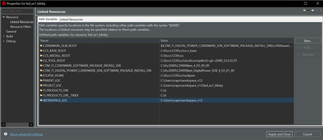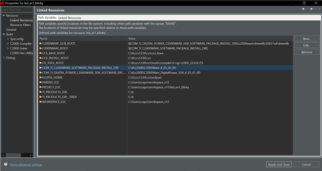 正如我之前所说、您的 C2000WARE_ROOT 路径未定义、也就是缺失了。 您需要将其添加进来。 对于上下文、此路径应指向与 COM_TI_C2000WARE_SOFTWARE_PACK_INSTALL_DIR 相同的位置。 要执行此操作、请单击"New..." 并键入 C2000WARE_ROOT 作为名称、然后输入以下文本: ${COM_TI_C2000WARE_SOFTWARE_PACKAGE_INSTALL_DIR}。 然后重新编译您的项目。