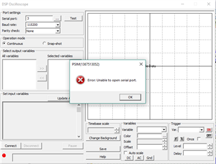 SCI (串行通信接口)"。因此、我关闭 SW1并短接 F28335中的 J9、然后生成代码 、但当我在 DSP 示波器中单击"CONNECT"时、它 显示错误 "Connection to DSP 无法建立"、因此无法正常运行。