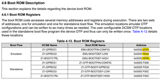 此器件上的地址有两个描述、一个是矢量表的复位矢量、另一个是 EMU-BOOTPIN-CONFIG。