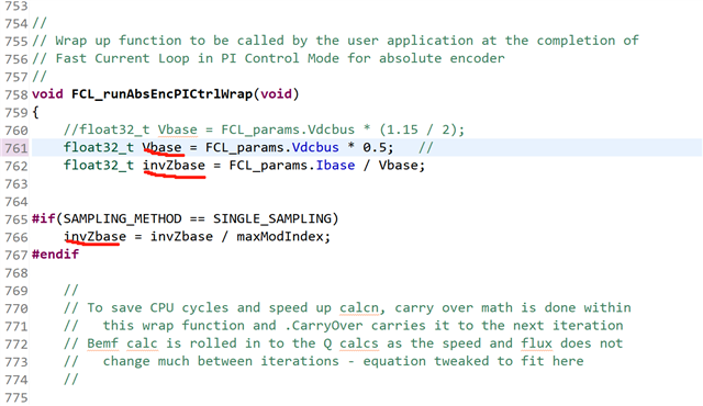 我必须在这个电流环路的 Kp 参数内部乘以 invZbase,这与我以前对 Kp=L*bandwith 的理解不同,不要太多,因为 Ki 的舍入对我来说更令人困惑。 我通常会了解 KI = R/L、给定公式 pi_id.Ki = FCL_params.Rd * invZbase * FCL_params.wccd * FCL_params.tSamp;有 invZbase、FCL_params.tSamp 和其他参数、这是如何计算的?