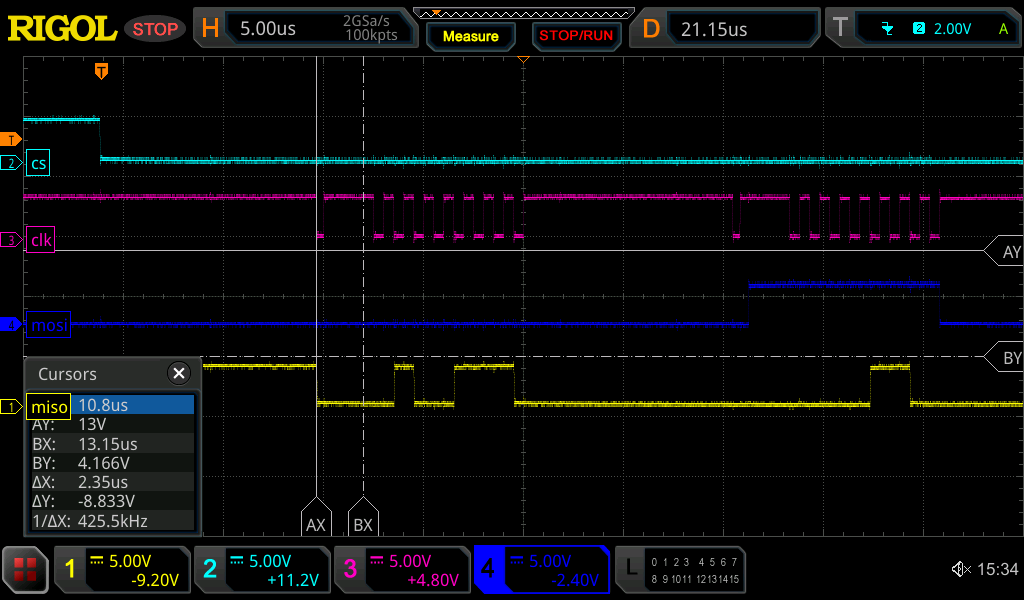 然而、 在下降沿方案(Cpol = 1、Cpha = 0或1)上、我看到时钟线上有一个异常行为。