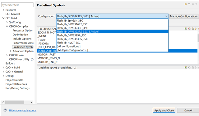 在本例中、您可以看到激活编译配置为 Flash_lib_DRV8323RS_3Sc、因此我生成的文件夹将共享该名称。 理想情况下、您将为您的项目创建并使用一个名为 Flash_lib_DRV8323RH_3Sc 的定制构建配置。