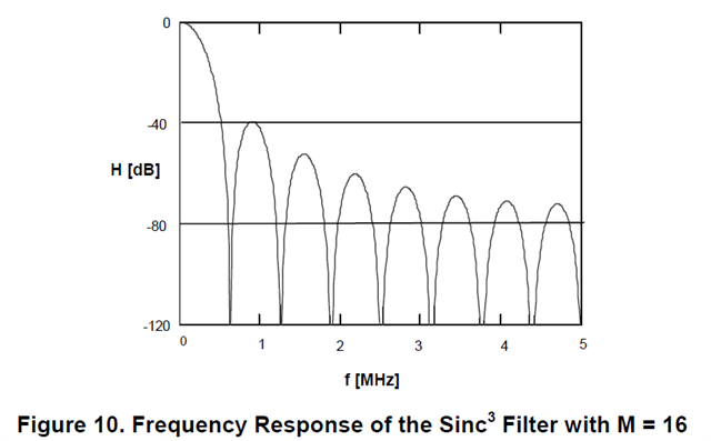 应用手册 sbaa094提供了下图、其中显示了 FS = 10MHz、OSR = 16时 SINC3滤波器的增益响应。
