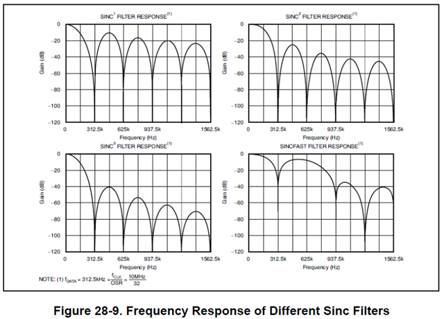 同样、技术参考 spruii0f (在 SDFM 第28节中)以下图显示不同 sinc 滤波器的增益响应。