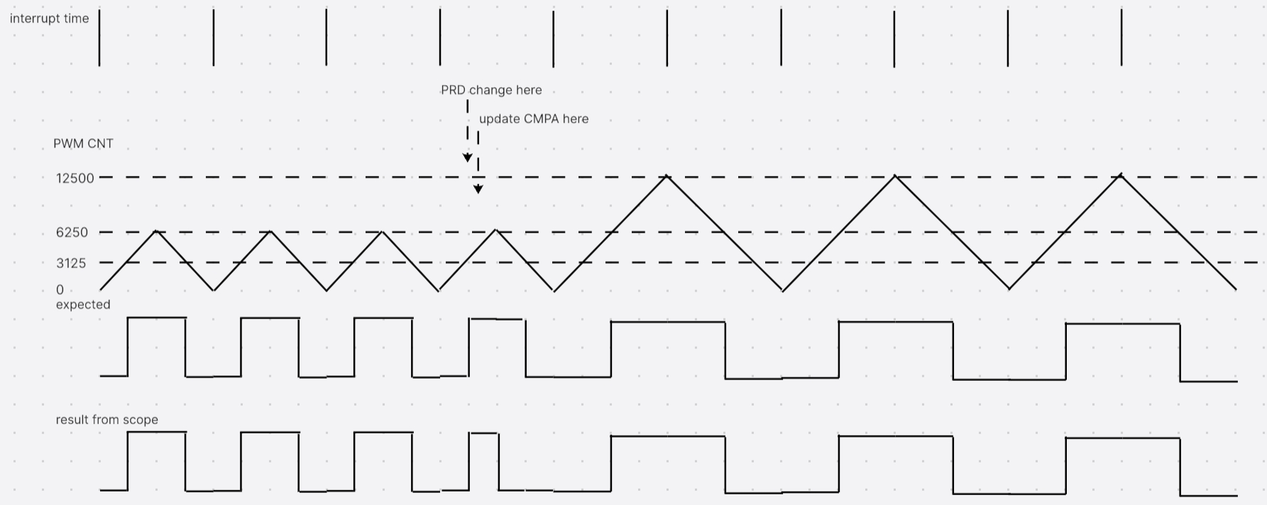 如果图像不清楚,让我解释一下: 顶行表示固定的中断触发时间(16kHz)。 下面的两个垂直箭头表示代码的近似执行位置:首先更改 PRD 值(从12500更改为6250)、然后计算新的 CMPA 值(从6250更改为3125)。 在两个箭头之前、PWM 波形为16kHz、占空比为50%。 在两个箭头后面、PWM 切换到占空比为50%的8kHz 波形。 第二行是计数器(CNT)值。 第三行是预期的 EPWM 波形。 第四行是示波器捕获的实际波形。