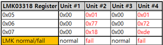 3. 在三个有缺陷的器件上、0x05至0x07的值不是0x00。 (单元2、单元4和单元3 -更改 LMK IC 之前)