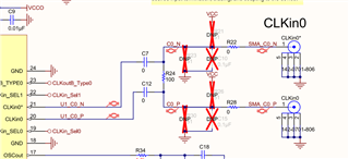 我使用50欧姆源100 MHz 正弦信号驱动 CLKin0引脚。 我放置在 R30 50 Ω 和 C10 100nF 上。 我移除了100 Ω R24。 CLKin0*端接50 Ω。 R28和 R22是100nF 电容器。 所以输入是交流耦合的。