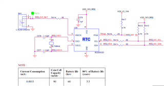 我们在设计中使用 BQ32002D RTC 时钟芯片。 请参阅下面的原理图以供您参考、我们正在使用 Duracell 和 Panasonic 的 CR2016纽扣电池。