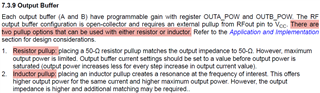 您好、需要了解射频输出线路的帮助。 不同输出对 RFoutA 和 RFoutB 的输出功率差是多少? 为什么一个具有上拉电阻器、另一个具有电感器? 在 RFoutBP 和 RFoutBM 部分中、电阻器 T 网络可能会导致功率下降。 它真的是必需的吗?