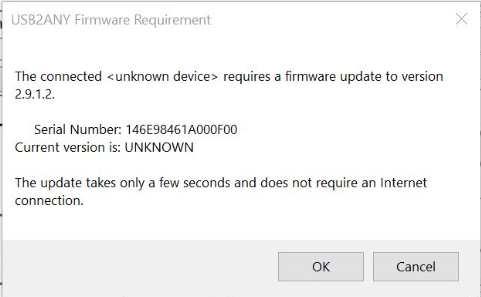 1.打开 TICS Pro、然后将 USB 电缆插入 USB2ANY、您可能会得到此信息