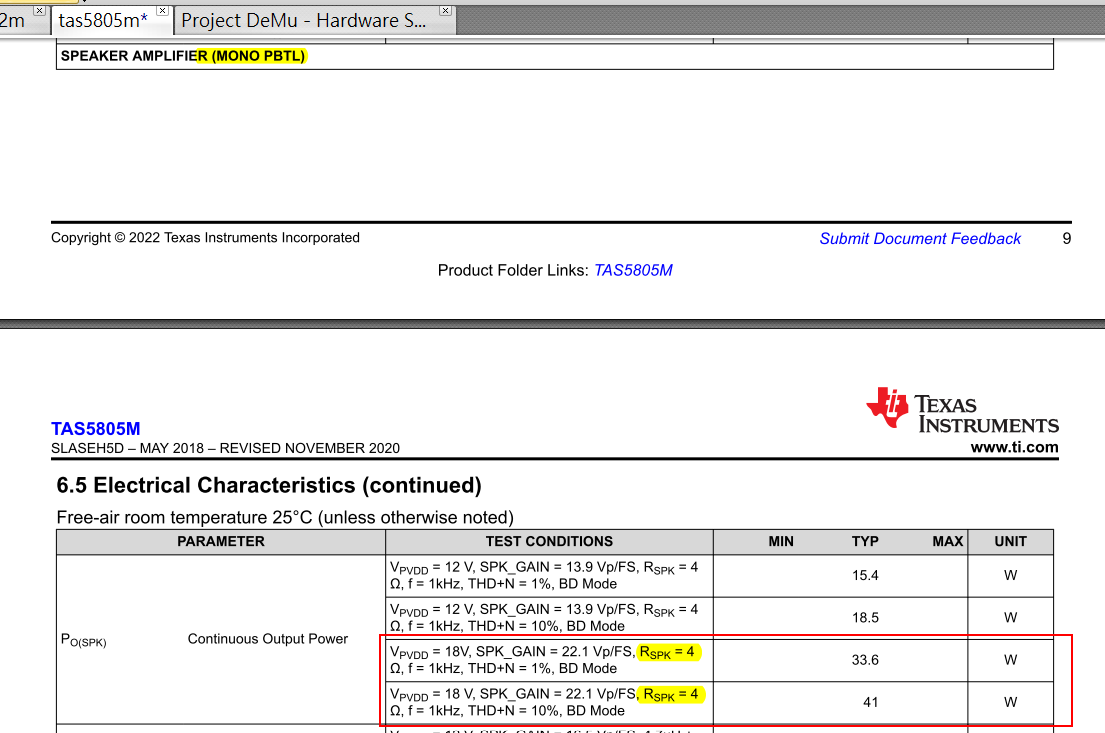 在我的测试中、无法使用此用例 (8 Ω、35W RMS、PVDD = 20V、THD 为 1%)。 它受电压限制、因此输出端会产生削波结果。 要获得 8 欧姆规格的 35W RMS 1% THD、您需要增大 PVDD 电压。 TAS5822M 也会出现同样的规格。 尽管这些器件能够提供高 输出功率、但需要足够的电压、尤其是在阻抗较高的负载下。