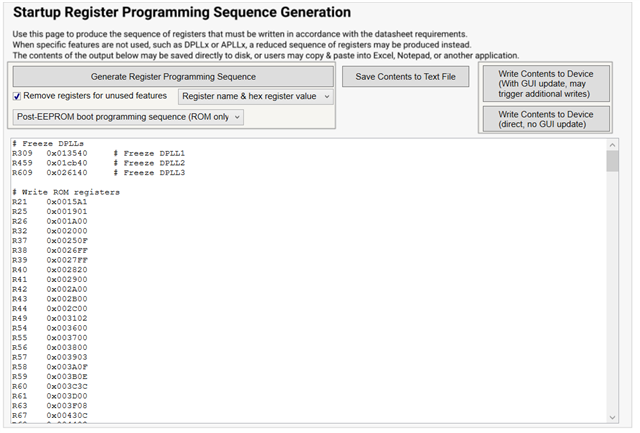 。 寄存器映射编程 列表只是从 R0 到 Rn 的一个寄存器顺序列表、不建议将其作为正确的启动序列。 建议更多地用于存储寄存器配置以供参考。