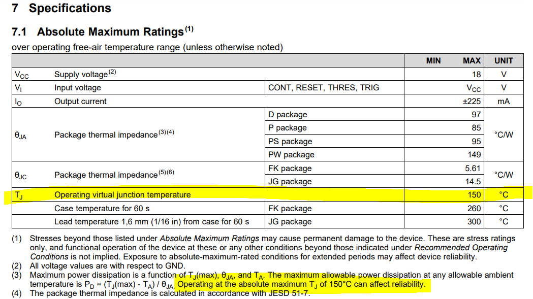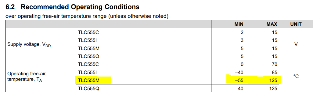 SE555工作温度为-55至125C。 与此工作温度范围相匹配的下一个最接近的设备是 TLC555M,如下所示。 我们没有计时器设备,建议在125摄氏度以上的环境下工作。 TLC555M 最大工作接线温度为150C,但在 ABS 最大接线温度为150C 时操作设备可能会影响产品数据表中所述的可靠性。