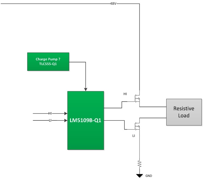 如何使用TLC555-Q1计时器来驱动具有48V总线的半桥的高侧FET的充电泵电路? 有可能吗?