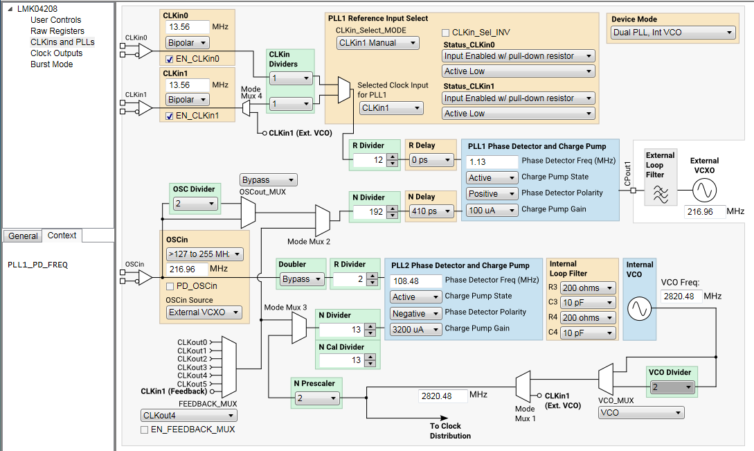 输入频率:13.56MHz,输出频率:13.56MHz;27.12MHz和216.96MHz;现在我正在使用lmk0.4208万评估板和TIC Pro软件进行设置