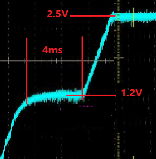 在您发送的屏幕截图中,Vcc明显比Vcco快,这会导致Vcc到Vcco引脚之间的内部电流,直到Vcco在4 ~毫秒后达到Vcco电压容差(+/- 5 %)范围内。