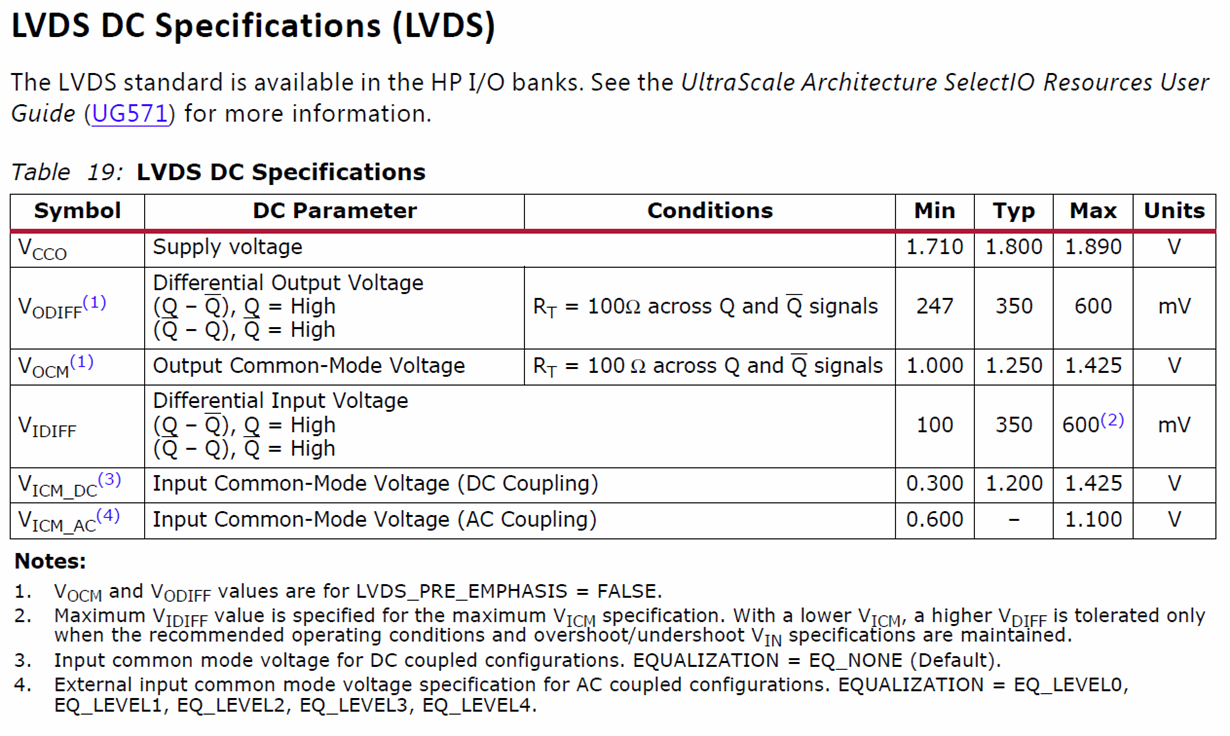 我希望将LMK61E2与Xilinx的Kintex UltraScale FPGA用于原型主板,我对LVDS规范有疑问。 从LMK61E2数据表来看, LMK61E2的LVDS输出特性似乎与FPGA的LVDS规范兼容,但 LMK61E2数据表上有VOUT,差分,PP差分输出峰间摆动规范,使我感到困惑。 VOUT,diff,PP是否指定最大VOH峰间值? 是否有人可以验证LMK61E2是否与下面的FPGA规范兼容?