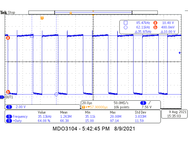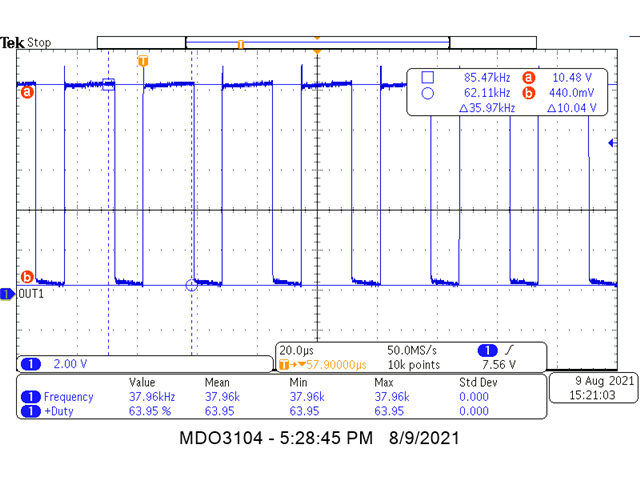 根据计算 、频率 F=38.9kHz、占空比 D=0.64%