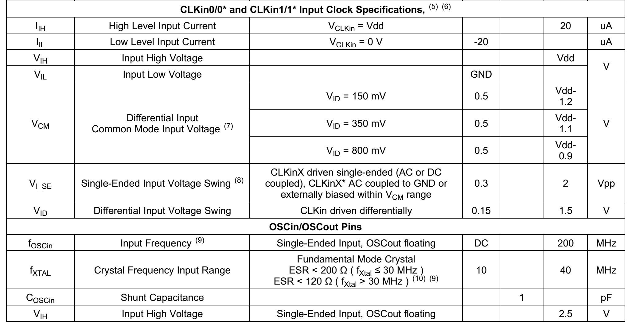 我已经阅读 了 LMK00101的数据表、但没有找到输入差分时钟输入 CLKin0/CLKin0*和 CLKin1/CLKin1*的频率范围的确切规格。 下表从数据表中提取,尽管 指定了 OSC 引脚的频率范围,  但并未提及 CLKin0/CLKin0*和 CLKin1/CLKin1*的频率范围。