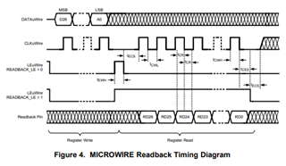这些位看起来会发生移位。 我通过 CPOL=0和 CPHA=0的 SPI 接口来驱动这个。 我的理解是、这些设置应与 uWire (在下降沿发送数据、在上升沿发送样本)匹配。 在8.5.3.1要点3中、显示"Data is valid on Falling Edge of CLK双线 制数据"。 uWire 规格是否不正确? 这不会解释写入 R9后位的移位、但这意味着移位后数据是正确的(如果在下降沿采样、则为0x5555 5540)。