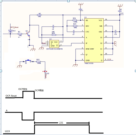 时序如下图所示。 这三个对应于 OCP_RESET、U3 A 引脚、U2.9信号、A 通道可识别上升沿触发、B 通道可识别下降沿触发。