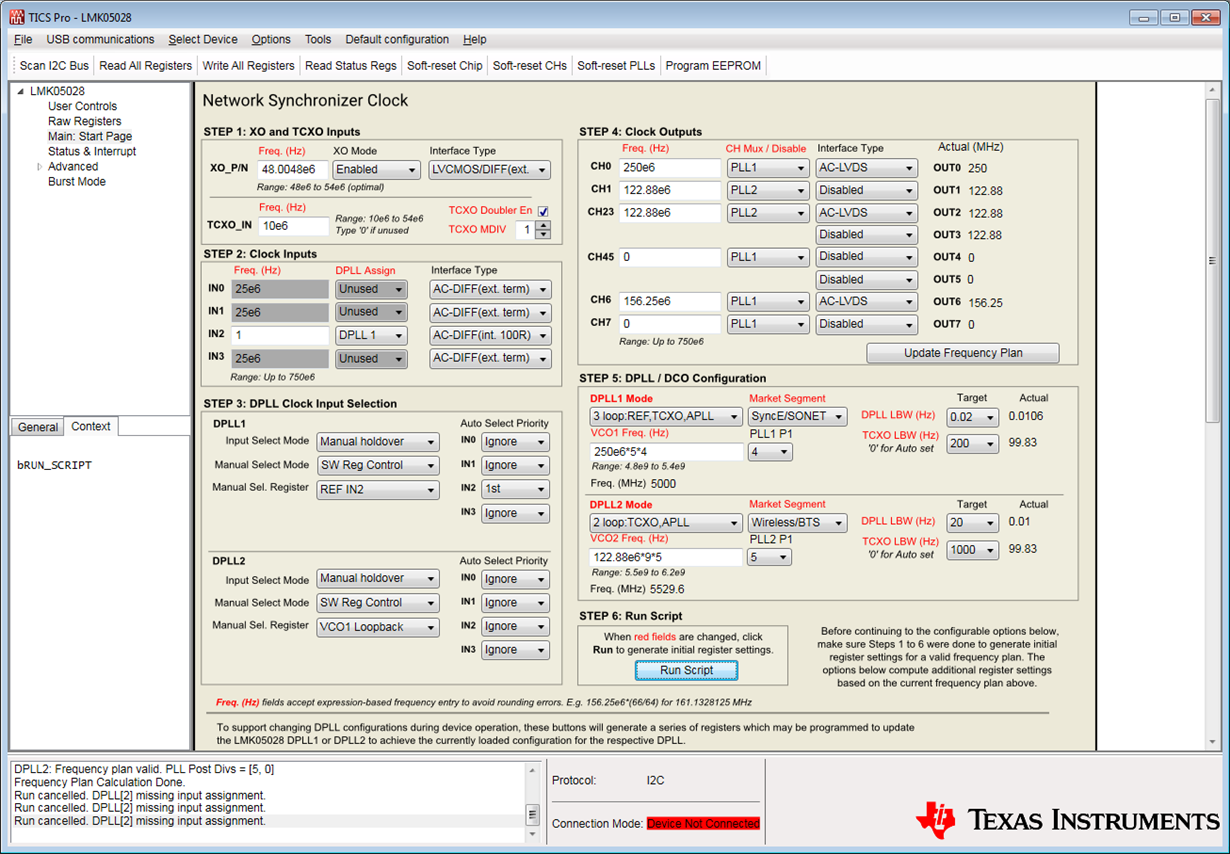 我选择 DPLL2模式是2环路 TCXO、APLL、输入基准是 VCO1 FB、但当我运行脚本时、TICS Pro 说运行已取消。 DPLL (2)缺少输入分配。