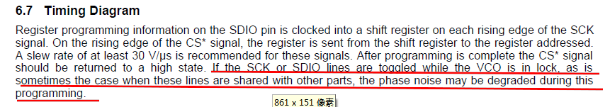 这取决于许多因素、包括 SCK/SDIO 边沿的压摆率、SPI 时钟速度、旁路电容器的位置和阻抗以及 PCB 布局寄生效应。 但是、例如、如果 SCK 速率为10MHz、您可能会在 SCK 运行时看到10MHz 杂散和谐波耦合到输出中。