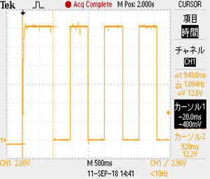 您可以看到、第一个周期比1Hz 的设置更宽。