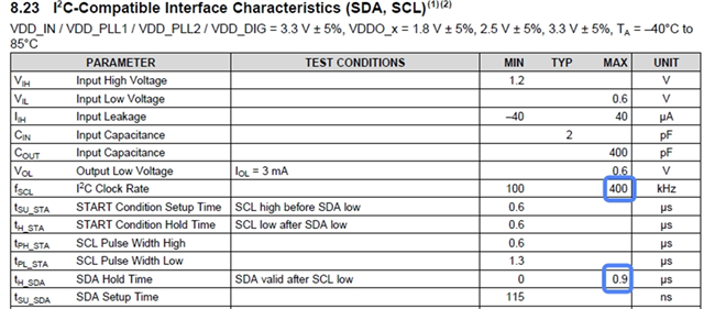虽然这可能在技术上具有功能、但这种情况将超出数据表规格-请参阅此帖子 :https://e2e.ti.com/support/clock-timing-group/clock-and-timing/f/clock-timing-forum/941783/lmk03328-i2c-clock-rate-and-sda-hold-time?tisearch=e2e-sitesearch&keymatch=lmk03328%252520hold#