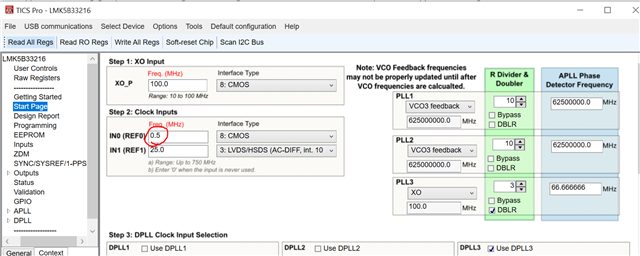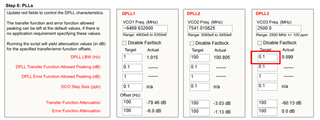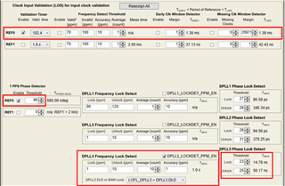 我的 APLL3 PDF 是66.66666MHz。 我从"status"页面检查锁定状态。 当我尝试在 REF0输入1Hz (0.000001MHz)时、如果我点击"读取状态"、DPLL3 LOPL_DPLL3、LOFL_DPLL3和 HLDOVR3将全部被检查。 但使用1MHz 输入时、复选标记消失了、看起来它已被锁定。 仅供参考、"开始页"步骤6 DPLL3设置如下所示。 DPLL LBW:10Hz、DPLL 传递函数允许的峰值:0.1dB、DPLL 误差函数允许的峰值:1dB、DCO 步长:0.1ppb、传递函数衰减:100、误差函数衰减:100。