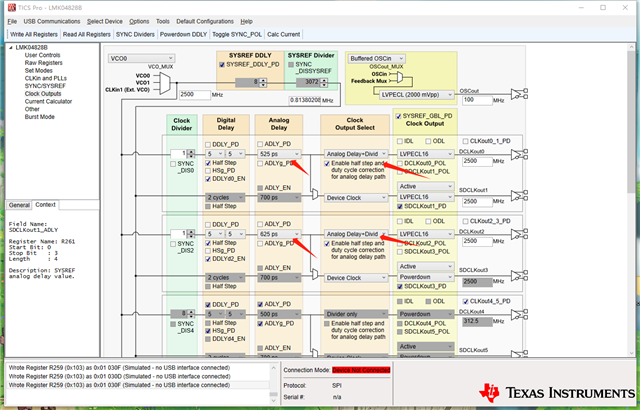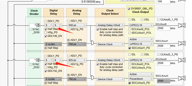 已知 VCO0为2500 MHz。 修改后的延迟为半个 VCO0周期、即它应为200ps、这意味着应将 dclkout0和 dclkout1反相。 但输出时钟实际上并不会改变。