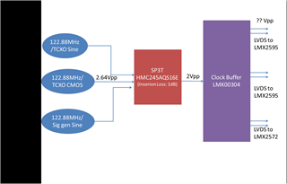 大家好、我想使用 LMK00304作为两个 LMX2595数和 LMX2572的输入缓冲器、来馈送 LVDS 差动信号、我有一些问题: