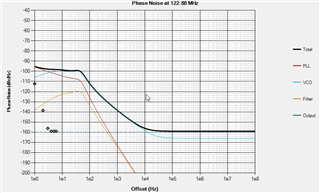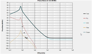 VCXO 的调谐范围 设置 PLLatinum Sim 中的 Kvco、当环路带宽受 Kvco 影响时、它也会受到 KPD、FPD 和环路滤波器系数值的影响。 如果您具有足够高的 FPD 和 KPD 值、并且选择 不会显著 限制带宽的环路滤波器系数、则可以使用更高的带宽。 例如、我在 PLLatinum Sim 中测试了10MHz 基准和具有2Hz/V 调谐范围的100MHz VCXO、我可以看到、在最大增益和特定环路滤波器值下、我可以获得20Hz 环路带宽。