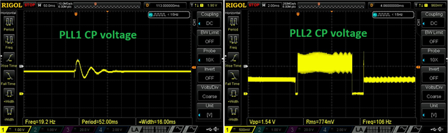 我具有正常工作的定制 PCB、LMK04906在双 PLL 模式下工作。 它与100MHz VCXO 配合使用。 我希望生成更高的频率、因此需要更大的内部 VCO 频率。 我找到了 LMK04808、它几乎与之相似、但具有更大的 VCO 频率。 我发现在 KVCO 的重要差异:16-21 vs 20-36。 我将其焊接到电路板上时考虑了引脚排列的所有差异(即大约5个电源/时钟输出引脚)。 它首次启动-输出正在发出信号、PLL1 DLD 显示始终锁定(在 LD_MUX 引脚上)。 但无法实现 PLL2 DLD。 我尝试与 PLL2预 N 分频器和 N 分频器值结合使用、并尝试更改 PLL2环路滤波器的外部部分(C1、C2、R2)。 使用 PLLatinum Sim 中建议的值、对于带宽~200kHz、C1=0、12n、C2=5、4n、R2=0、47k、 将 C2更改为其他值10n、2,7n 和 doug Bailey 在此论坛上创建的线程中的值(环路带宽1、5MHz)、我也尝试了评估板中的值、但 PLL2仍无法锁定。 我还使用 LD_MUX 引脚来测量频率、PLL2R/2上的频率正确(50MHz)、但在 PLL2N/2上仍然不正确(~58MHz 或~48M、取决于 Pre-N_Divider 和 N Divider 值)。 DAC 锁定/低电平/高电平为低电平。 在 LMK04906中、一切都正常工作、我几乎可以肯定、原因只是 LMK04906和 LMK04808的一些内部差异。 PLL2极性为负值、3、2nA、基准和相位检测器频率为100MHz。 我还可以查看或尝试哪些内容?