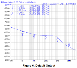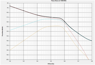 我已经按照用户指南图1所示的 EVM 连接图进行了操作、并使用具有适当输入电平的高质量信号发生器来提供此默认配置所需的100 MHz 参考时钟。 我已验证它不应该干扰我的测量、因为该音调的相位噪声明显低于 PLLatinum sim 仿真的整体相位噪声。 它在100Mhz 范围内更高、但我主要关注最高10MHz 的总体相位噪声: