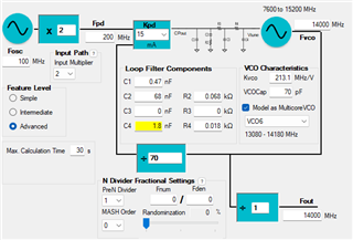 尽管如此、我仍然看到比 PLLatinum 仿真的相位噪声差得多(几乎在整个频率范围内下降大约12至18dBc/Hz)。