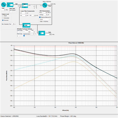 我已经在仔细斟酌这个问题、并同意您的看法、即我所使用的基准信号确实非常差。 我已经切换到更干净的基准(10MHz OCXO)、并将其包含在 PLLatinum sim 中、为 我正在使用的 LMX2694EPEVM 评估板生成新的环路滤波器配置。 我没有注意到我可以在工具中考虑基准时钟噪声、但现在我正在这样做、它看起来不会像我的旧基准那样影响我的测量。