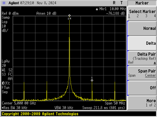 最后、在测量输出频谱时(始终处于启用10 MHz 外部基准和基准倍频器的4960 MHz 处)、我注意到- 10 MHz 杂散、抑制效果不佳: